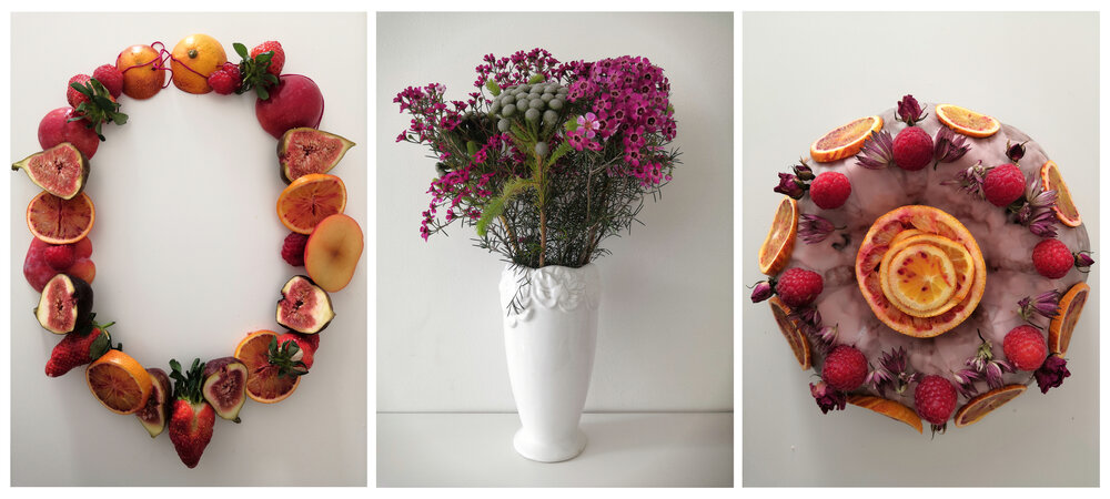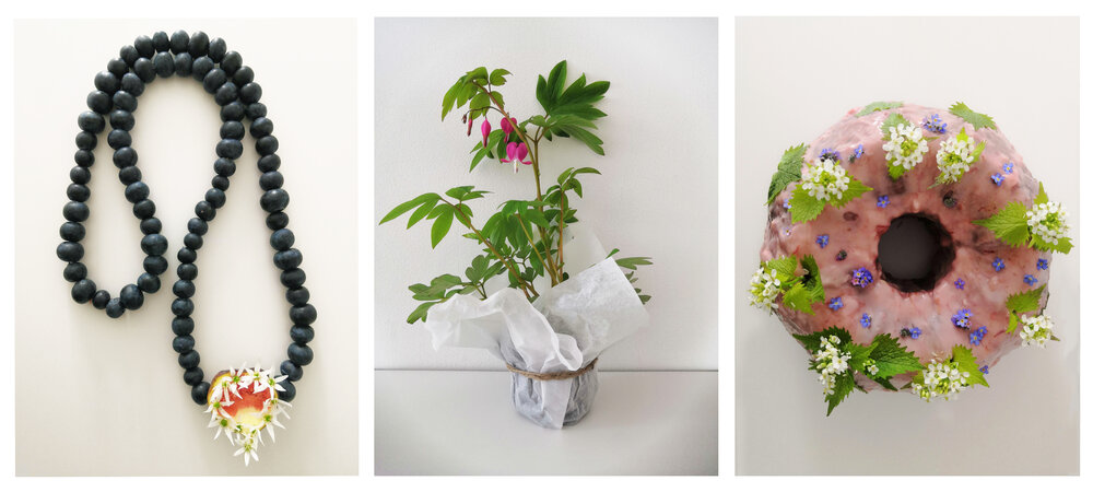 Tryptychs 2021-2024 / Grandfather (top), Lent with Eve (middle), Protection for Joan (bottom), edible/wearable sculpture with inedible plants.